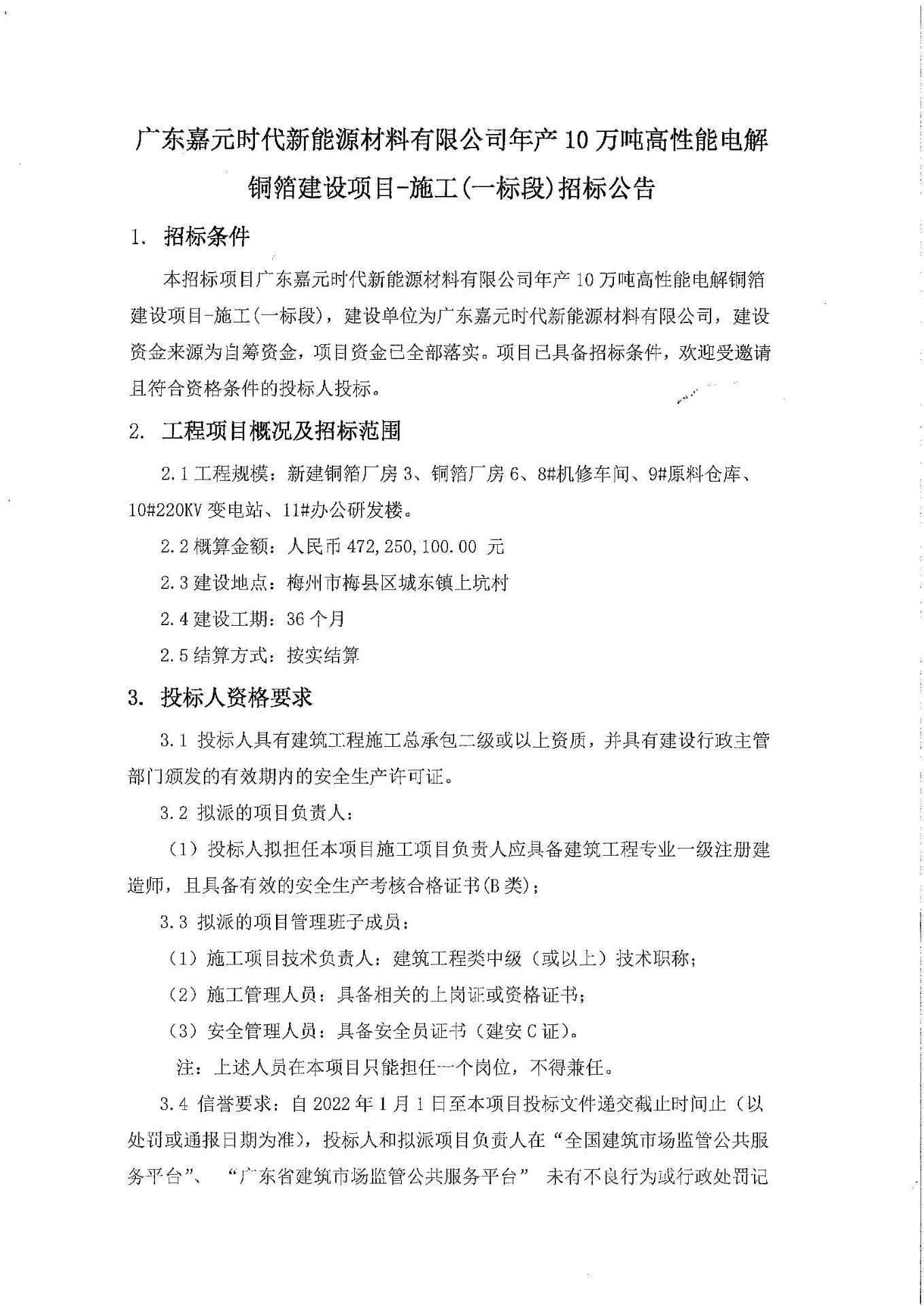 廣東嘉元時代新能源材料有限公司年產(chǎn)10萬噸高性能電解銅箔建設(shè)項(xiàng)目-施工(一標(biāo)段)招標(biāo)公告