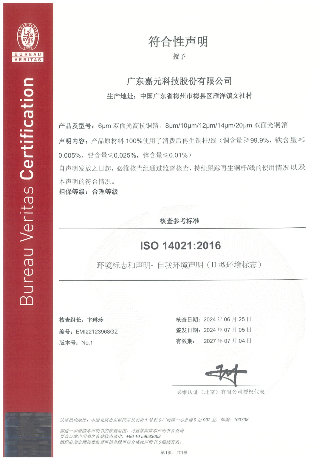 公司經(jīng)營管理層高度重視再生材料體系建設工作,于2024年春節(jié)后召開了再生材料體系實施項目的可行性論證會議,科學研討了企業(yè)實施再生材料體系建設的相關事項和工作計劃,并提出“關愛地球,減少資源浪費;和諧發(fā)展,使用再生材料;合規(guī)經(jīng)營,滿足客戶要求”的體系方針。圍繞體系建設目標,公司上下迅速動員行動,成立項目工作領導小組,給予人、財、物等全方面支持,有序開展ISO14021:2016標準培訓,并結合正在執(zhí)行的質量管理體系進行再生材料體系文件的優(yōu)化、修改和完善,進一步健全了體系標準。同時,公司以雁洋基地作為生產(chǎn)場所,圍繞體系建設要求對車間進行設備更新、節(jié)能改造升級。供應鏈中心積極做好各項準備工作,明確了消費后再生銅料供應商資質。各部門在工作領導小組的組織下,緊密溝通、配合,全力推動再生材料體系建設有條不紊進行。據(jù)了解,再生材料體系適用公司6μm雙面光高抗銅箔,8μm、10μm、12μm、14μm和20μm雙面光銅箔等產(chǎn)品,相關產(chǎn)品原材料100%使用消費后再生銅桿/線(銅含量≥99.9%,鐵含量≤0.005%,鉛含量≤0.025%,鋅含量≤0.01%)。目前體系所有流程在公司內部試運行達3個月以上,運行效果良好,制程能力、產(chǎn)品質量達到預期效果。經(jīng)必維認證(北京)有限公司核查,于2024年7月5日取得《ISO14021:2016 環(huán)境標志和聲明-自我環(huán)境聲明(II型環(huán)境標志)》證書。未來,嘉元科技將持續(xù)提升綠色競爭力,在綠色發(fā)展的道路上行穩(wěn)致遠,為新能源事業(yè)作出新的貢獻。
